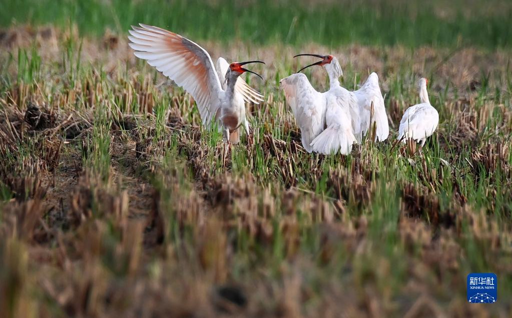 9月22日,幾只朱鹮在洋縣謝村鎮的一片收割后的稻田里嬉戲。