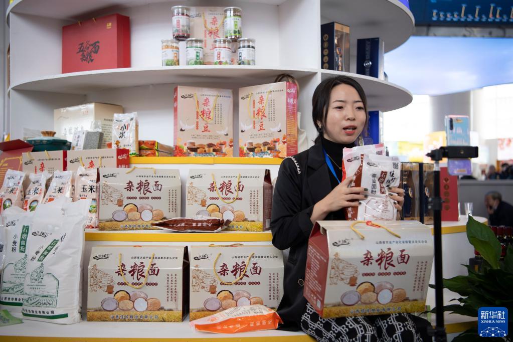 9月22日,一名參展商在位于山西省忻州市忻府區小檀村的雜糧產(chǎn)品展示展銷(xiāo)展廳內進(jìn)行直播銷(xiāo)售。
