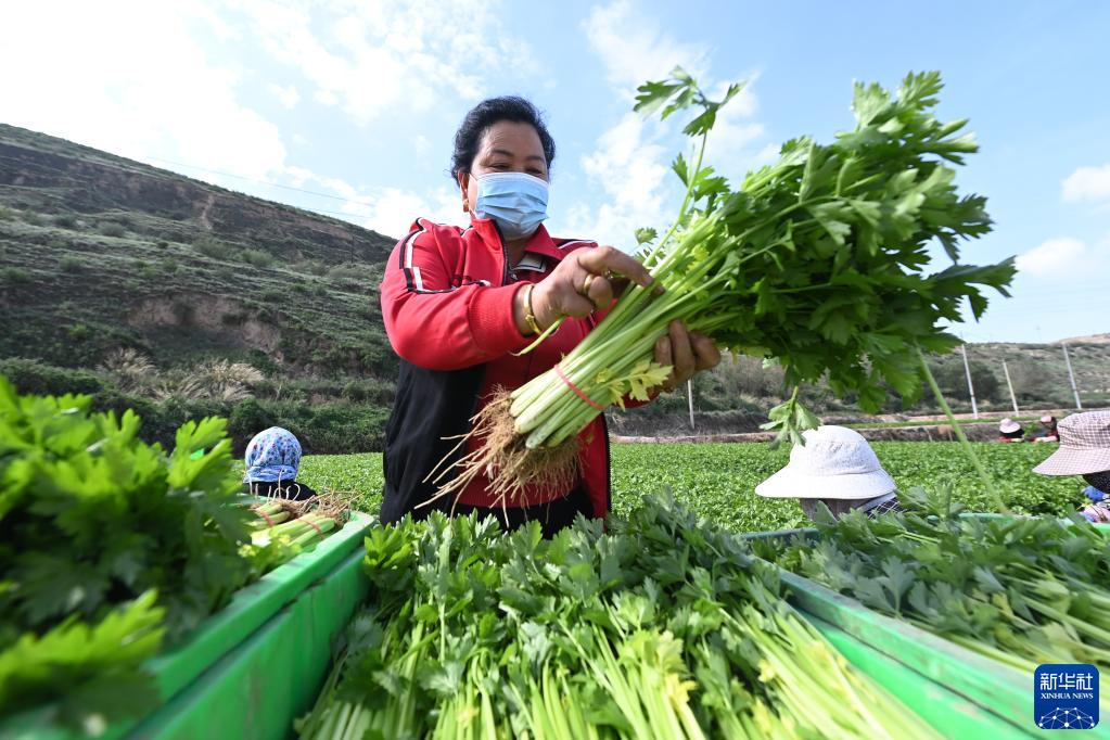 9月20日,在榆中祥龍蔬菜產(chǎn)銷(xiāo)專(zhuān)業(yè)合作社種植基地,豆俊蘭整理采收的芹菜。