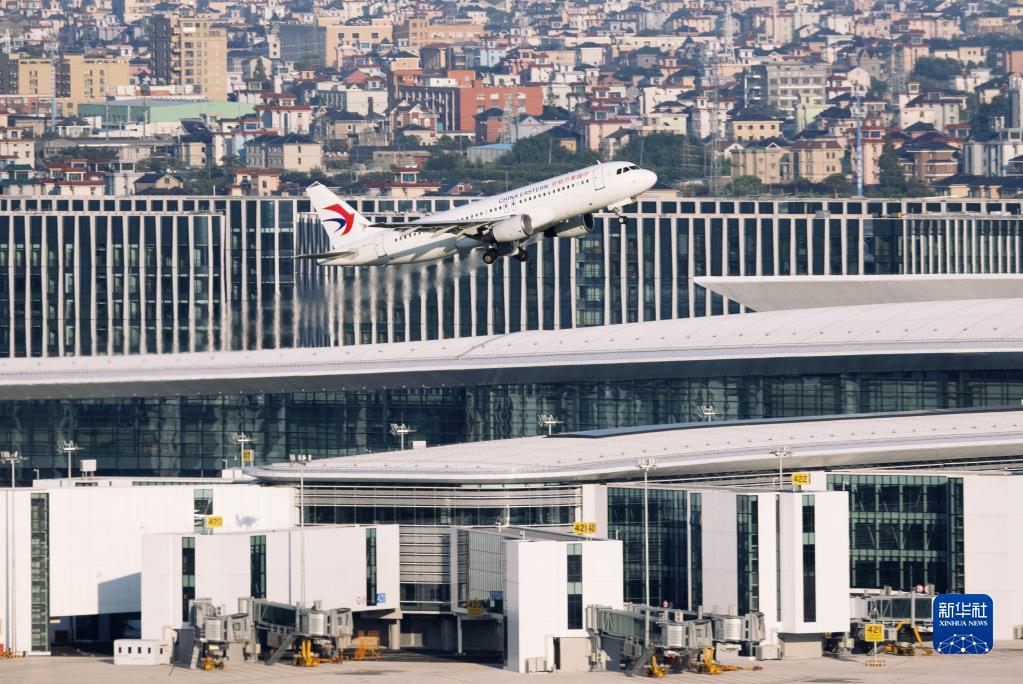 9月22日,一架東航客機從杭州蕭山國際機場(chǎng)三期T4航站樓前起飛。