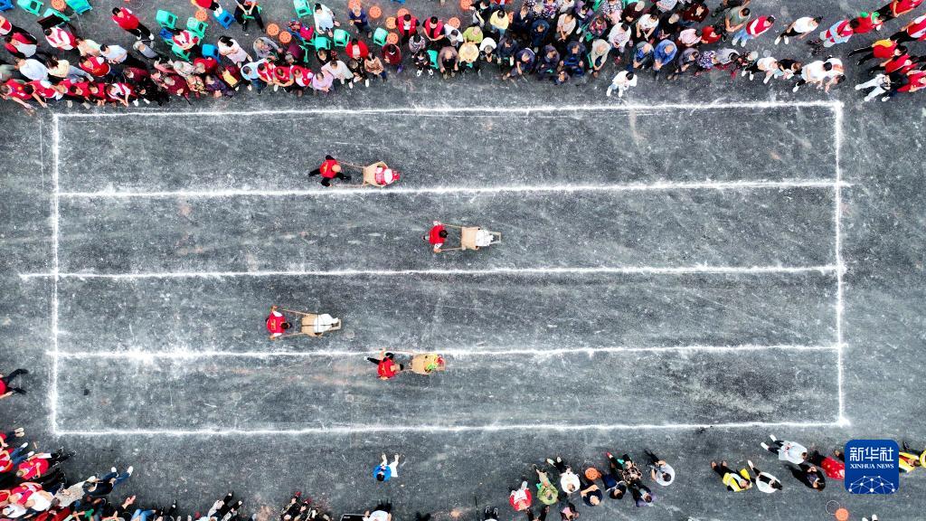 9月21日,在四川省眉山市仁壽縣方家鎮農民趣味運動(dòng)會(huì )上,村民們參加推“雞公車(chē)”比賽(無(wú)人機照片)。