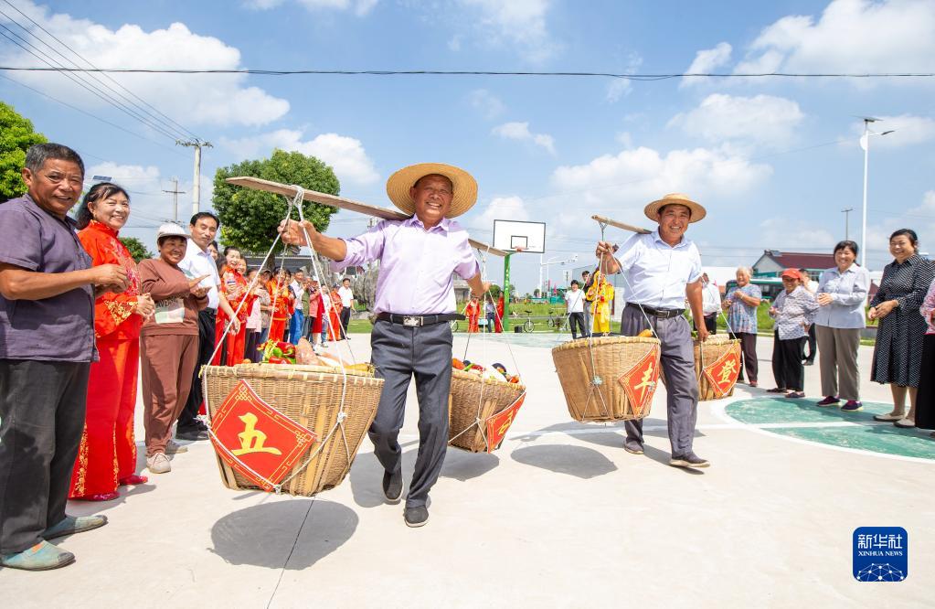 9月22日,江蘇省海安市角斜鎮老莊村農民參加挑籮筐比賽。