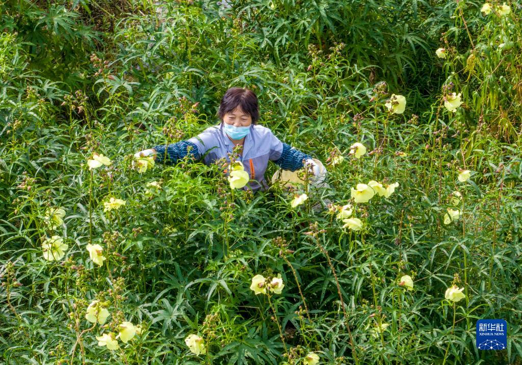 9月21日,江蘇省泰州市大泗鎮馬龍村村民在黃蜀葵種植基地采摘黃蜀葵(無(wú)人機照片)。