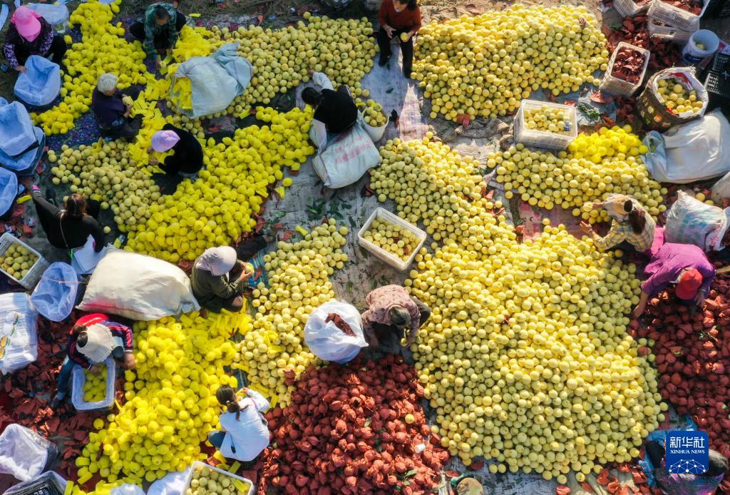 9月15日,在河北省遵化市東舊寨鎮五虎嶺,農民在分揀包裝剛采摘的秋黃桃(無(wú)人機照片)。