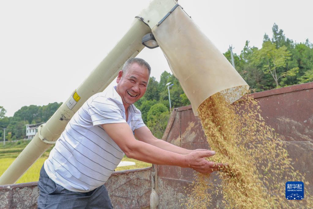 9月21日,貴州省銅仁市玉屏侗族自治縣田坪鎮彰寨村村民在收獲水稻。