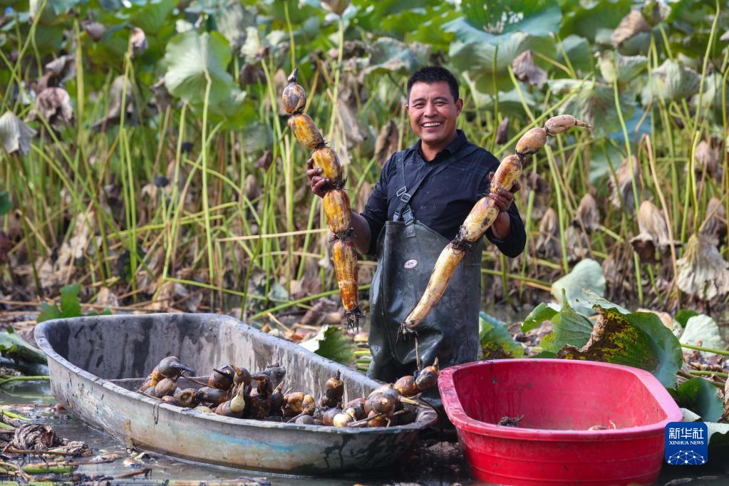 9月22日,在河南省信陽(yáng)市光山縣寨河鎮耿寨村新生合作社,農民收獲蓮藕。