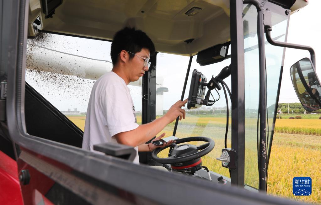 9月21日,在上海浦東新區宣橋鎮腰路村,技術(shù)員為一輛無(wú)人駕駛自動(dòng)收割機調試運行參數。這個(gè)村的5G網(wǎng)絡(luò )覆蓋稻田,使得無(wú)人收割機可以快捷高效完成稻米收割。