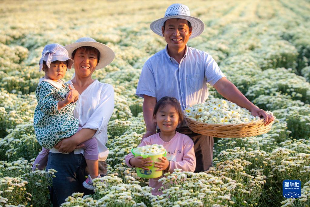 9月21日,在山東省淄博市高青縣黑里寨鎮黑二村,“70后”張新廣(右一)和家人在菊花田間合影留念。張新廣2019年流轉土地100畝建起家庭農場(chǎng),發(fā)展中藥材種植,年收入60萬(wàn)元。