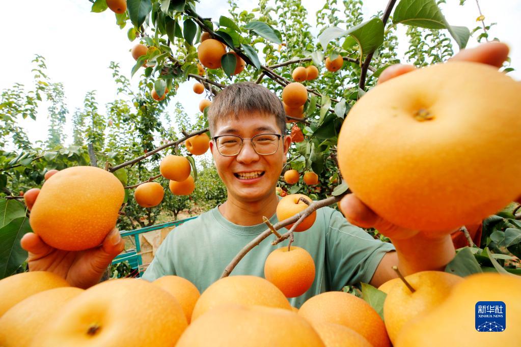 9月19日,在河南駐馬店市驛城區春興種植合作社,“90后”李彬采摘成熟的梨子。李彬返鄉創(chuàng )業(yè)從事瓜果種植,引種的有梨、黃桃、羊角蜜瓜等品種,分季上市。最近,他種植的3000畝梨子喜獲豐收。