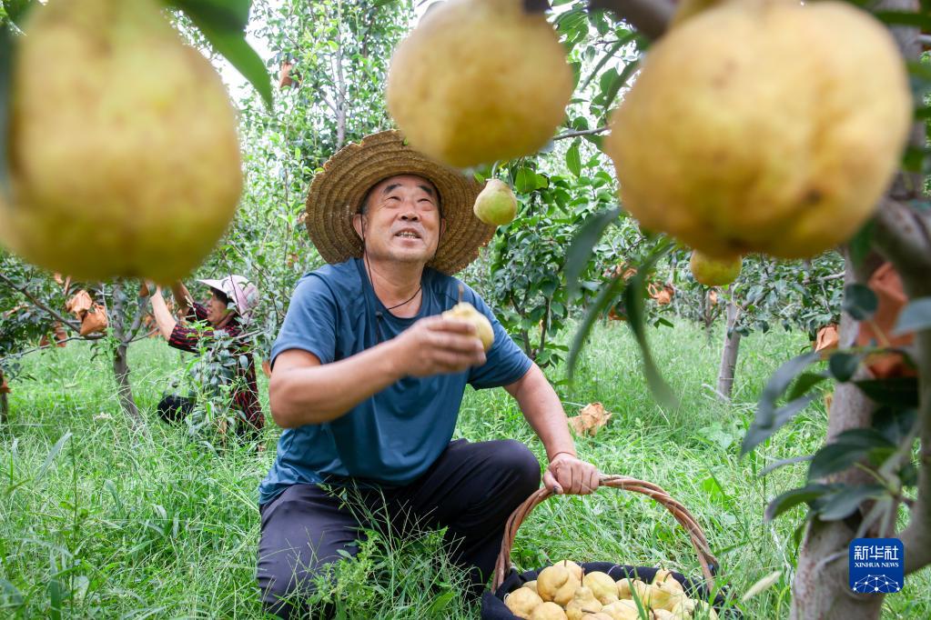 9月20日,在山東省淄博市高青縣黑里寨鎮大圣寺村,“50后”王宗剛和老伴李秀榮采摘丑梨。2019年,王宗剛退休后回到農村老家,和老伴流轉土地52畝,建起家庭農場(chǎng),發(fā)展丑梨種植。今年預計產(chǎn)量達到8萬(wàn)斤,收入20多萬(wàn)元。