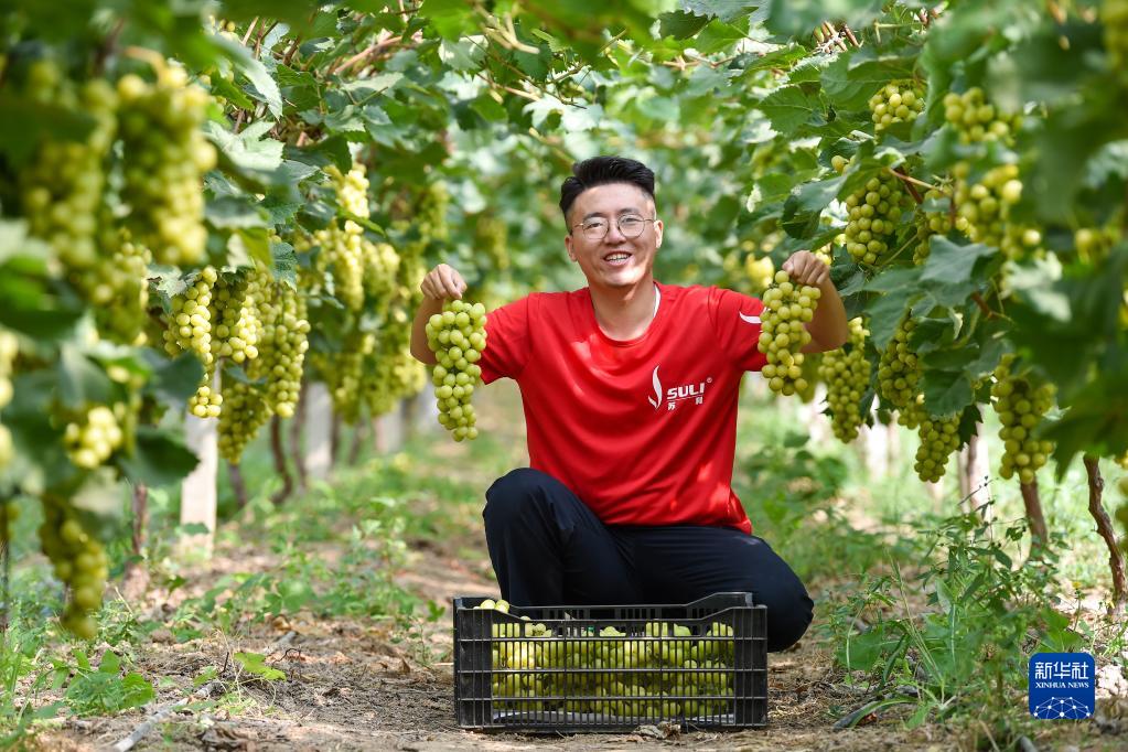 9月23日,在江蘇省宿遷市宿城區陳集鎮王莊村,“00后”汪碩展示剛采摘的無(wú)公害葡萄。汪碩2021年畢業(yè)后回到家鄉從事葡萄種植。近期,他種植的150畝葡萄進(jìn)入豐收季。