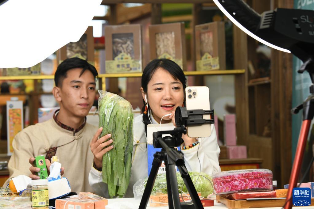 9月23日,在四川省成都市天府農業(yè)博覽園2號展館,金秋消費季農產(chǎn)品產(chǎn)銷(xiāo)對接活動(dòng)參展商在進(jìn)行直播。