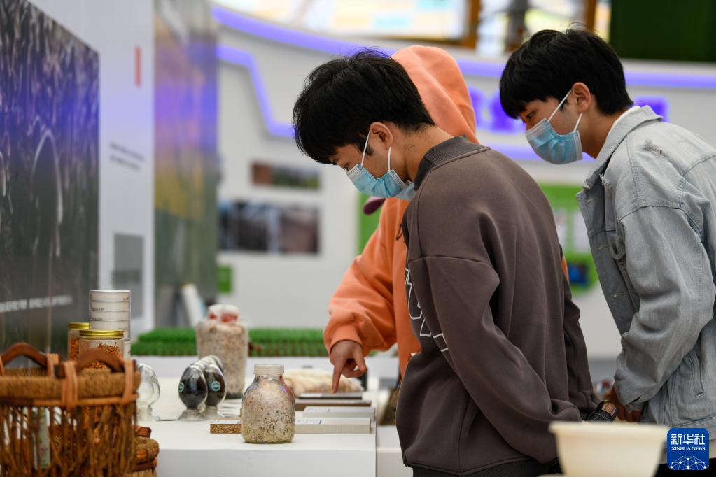 9月23日,在四川省成都市天府農業(yè)博覽園“大國糧倉科技館”內,市民在參觀(guān)秸稈做基質(zhì)種植大球蓋菇。