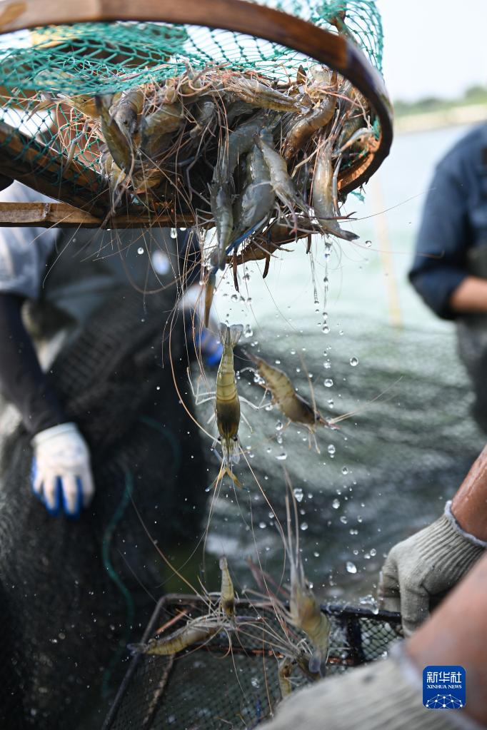 9月23日,豐盛灣水產(chǎn)養殖基地的工人在分裝捕獲的沼蝦。