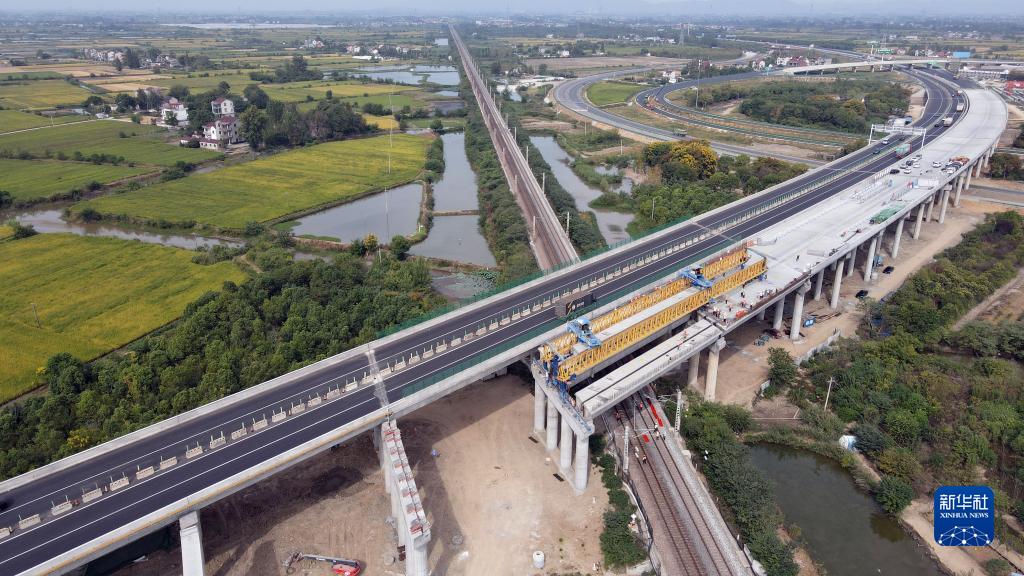 9月23日拍攝的蕪合高速公路上跨淮南鐵路箱梁架設施工現場(chǎng)(無(wú)人機照片)。