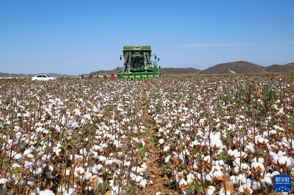采棉機在新疆生產(chǎn)建設兵團第五師雙河市八十六團的一處棉田采收棉花(9月18日攝)。