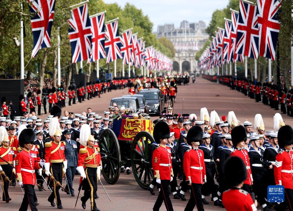 9月19日,在英國倫敦,人們護送英國女王伊麗莎白二世的靈柩從白金漢宮附近經(jīng)過(guò)。