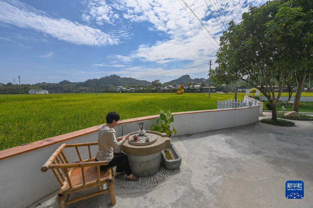9月24日,游客在太陽(yáng)鎮太陽(yáng)村稻田邊的“稻香別院”特色餐廳院子內喝茶賞景。今年上半年羅虹與合伙人一起在太陽(yáng)鎮太陽(yáng)米稻田基地旁邊租下一幢空置的房屋,打造集田園觀(guān)光、休閑、餐飲為一體的稻香特色餐廳。