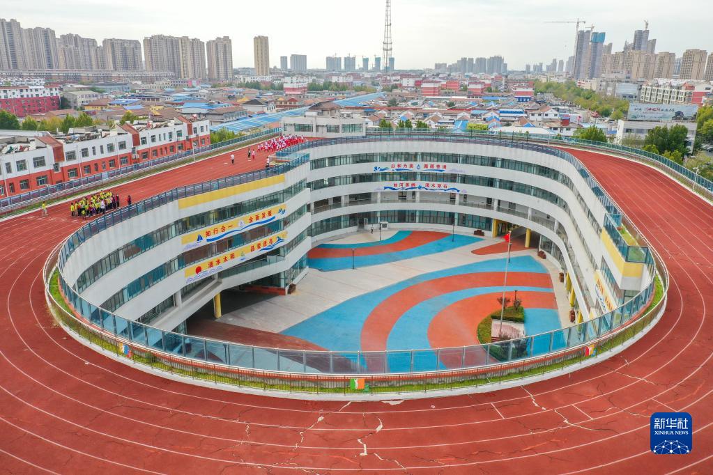 這是9月20日拍攝的齊河縣第六小學(xué)(無(wú)人機照片)。這所地處鬧市的學(xué)校將地下停車(chē)、地上教學(xué)、運動(dòng)場(chǎng)地分層穿插布局巧妙融合,節地率達到54%。