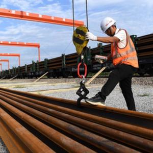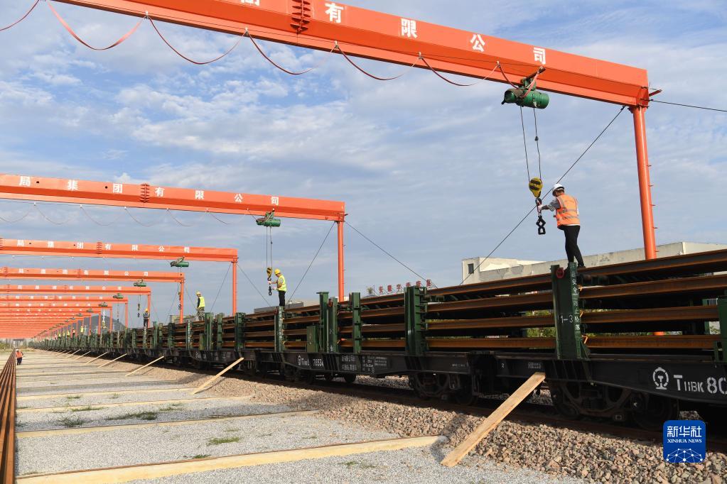 9月24日,在中鐵十一局池黃鐵路鋪軌基地,工作人員進(jìn)行卸軌作業(yè)。