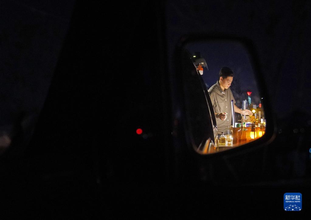 在南昌市紅谷灘區的一處空地,呂琦飛在調酒臺上做準備(9月22日攝)。