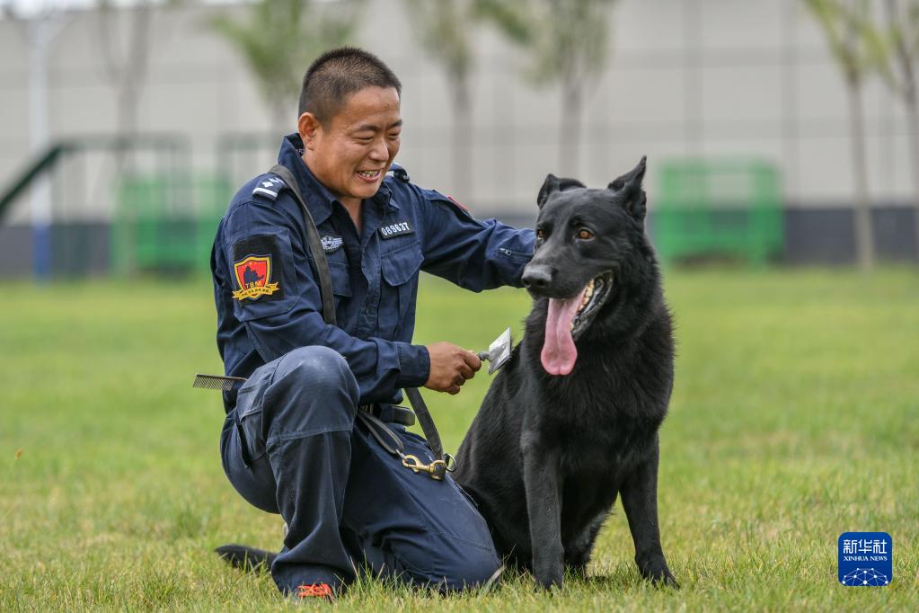 9月20日,治安犬“黑豹”和訓導員肖芝鎮在訓練間隙休息。