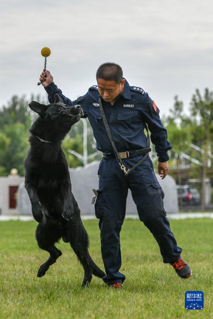 9月20日,治安犬“黑豹”和訓導員肖芝鎮在訓練間隙休息玩耍。
