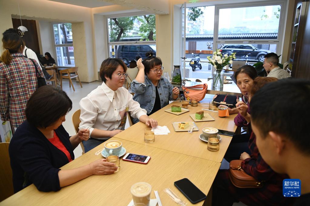 9月24日,聽(tīng)障咖啡師陳佳悅(左二)在自己經(jīng)營(yíng)的咖啡館里與聽(tīng)力殘疾人家屬們進(jìn)行交流。