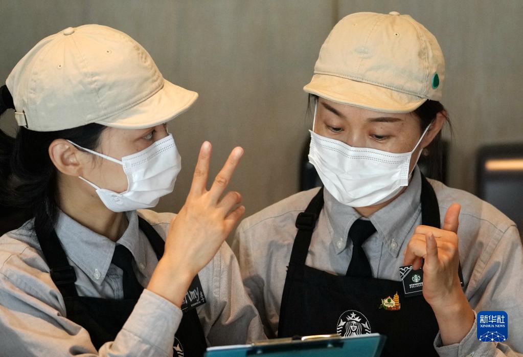 7月4日,在星巴克西安翠華里手語(yǔ)店,“無(wú)聲咖啡師”公益培訓項目學(xué)員、聽(tīng)障咖啡師王茹(右)和聽(tīng)障咖啡師李莎通過(guò)手語(yǔ)交流。