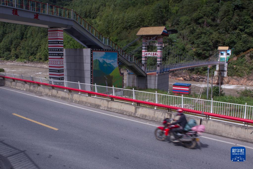 2022年9月14日,怒江州福貢縣拉甲木底村居民駕駛摩托車(chē)從拉甲木底橋下駛過(guò)。這座橋將過(guò)街天橋和過(guò)江橋梁相結合,方便行人過(guò)江、過(guò)街。新華社記者 岑云鵬 攝