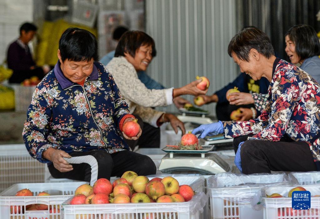 9月26日,在陜西省潼關(guān)縣港口社區東臺塬,裕興農業(yè)開(kāi)發(fā)有限公司的員工在分揀軟籽石榴。