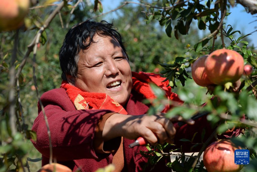 9月26日,在陜西省潼關(guān)縣港口社區東臺塬,裕興農業(yè)開(kāi)發(fā)有限公司的員工在采摘軟籽石榴。