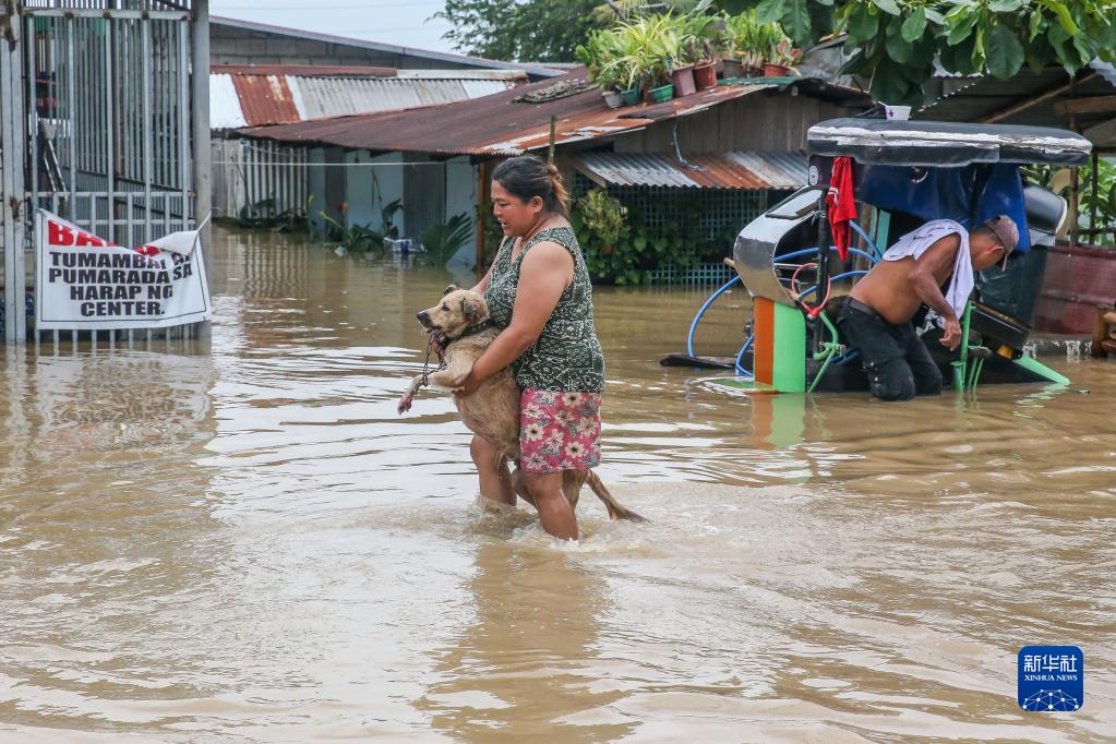 9月26日,在菲律賓布拉干省,一名女子抱著(zhù)寵物狗涉水出行。
