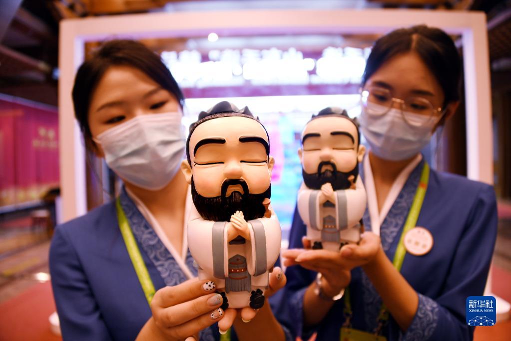 9月26日,兩名會(huì )務(wù)志愿者在展示文創(chuàng )孔子像。