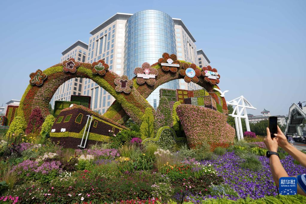 9月27日,市民在東單路口拍攝“開(kāi)放發(fā)展”花壇。