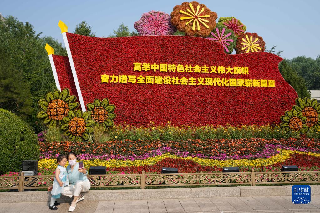 9月27日,市民在建國門(mén)西北角的“偉大征程”花壇前留影。