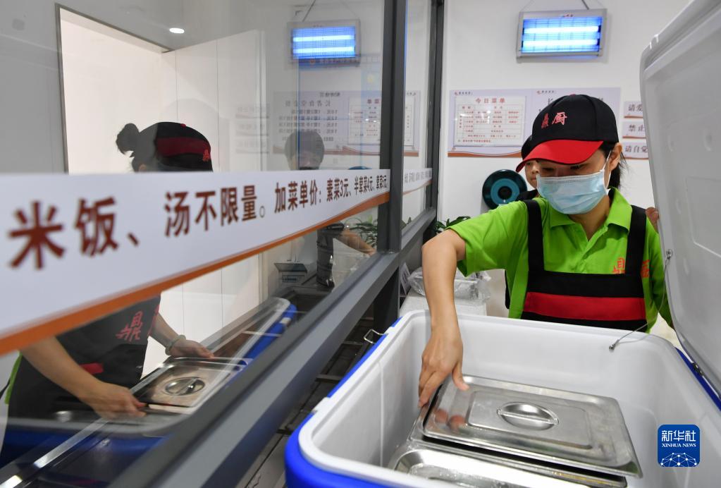 9月27日,在福州市華大街道屏山社區,工作人員取出統一配送的午餐。