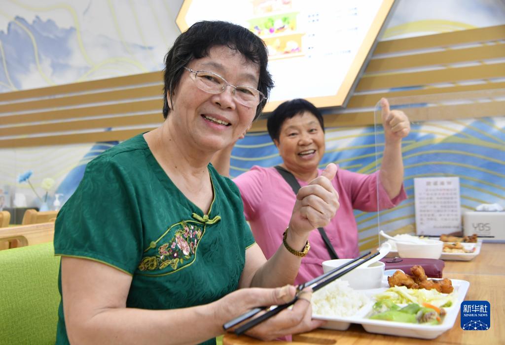 9月27日,在福州市華大街道屏山社區,71歲的黃慶萍(左)和73歲的錢(qián)美英為可口的午餐點(diǎn)贊。