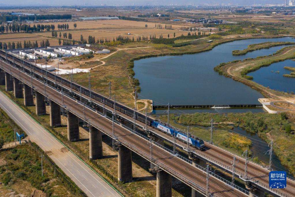重載列車(chē)行駛在大秦鐵路上(9月28日攝,無(wú)人機照片)。