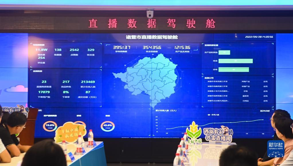9月28日,諸暨市共富直播周啟動(dòng)儀式現場(chǎng)的大屏幕上顯示共富直播周的觀(guān)看人數、銷(xiāo)售額、銷(xiāo)售種類(lèi)等實(shí)時(shí)數據。