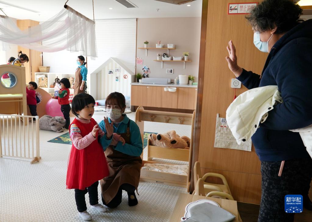 在江寧路街道社區綜合為老服務(wù)中心的“寶寶屋”,小朋友與外婆揮手說(shuō)再見(jiàn)(2022年3月7日攝)。