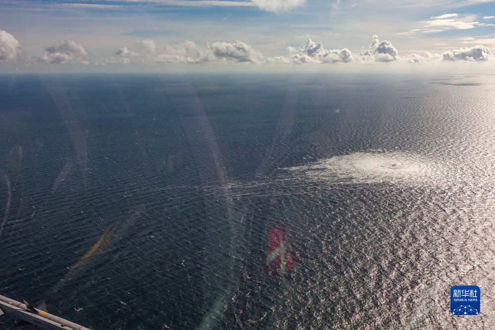 這張丹麥國防部9月27日發(fā)布的航拍照片顯示的是一處“北溪”天然氣管道泄漏點(diǎn)。