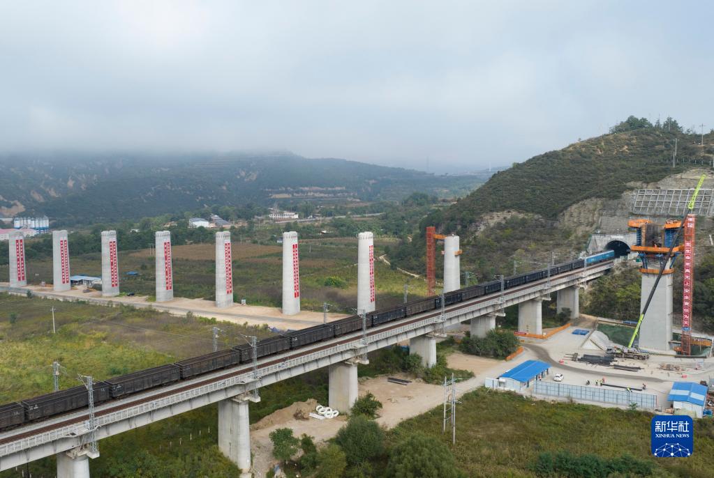 這是9月28日拍攝的位于陜西省延安市洛川縣的西延高鐵北洛河特大橋施工現場(chǎng)(無(wú)人機照片)。