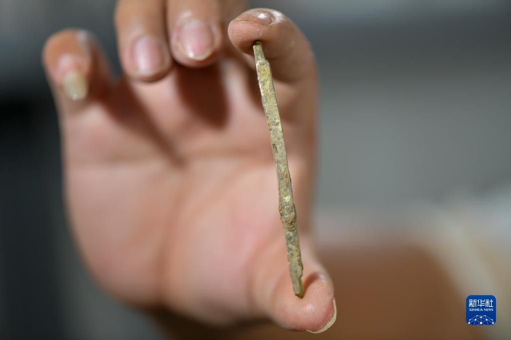 9月27日,考古發(fā)掘隊隊員程濤在臨時(shí)庫房?jì)日故境鐾恋你~簪。
