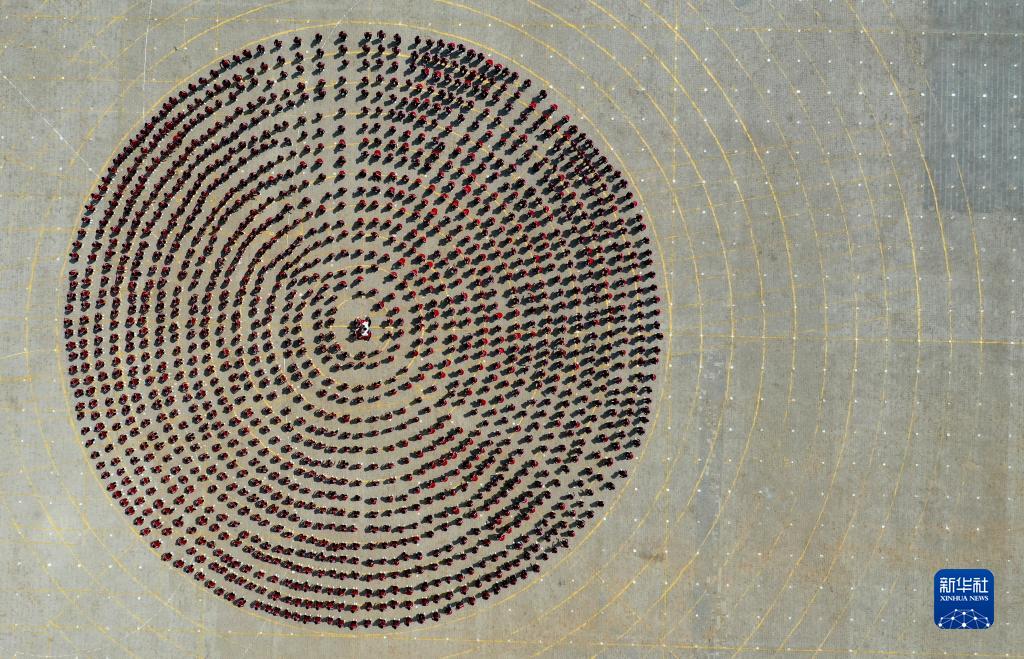 這是少林塔溝武校的學(xué)生們在塔溝武術(shù)博物院演武場(chǎng)演練大型武術(shù)團體操(2019年7月13日,無(wú)人機拍攝)。