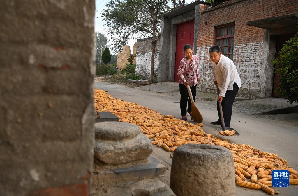西北綜勘黃河老腔藝術(shù)團的主唱薛銀照(右)和妻子在家門(mén)口晾曬玉米(9月26日攝)。劇團的全體成員都是當地農民,主業(yè)為種糧。
