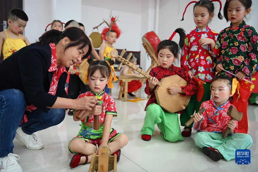 老腔藝人董轉玲(前左)在潼關(guān)縣城關(guān)北區幼兒園教孩子們使用樂(lè )器(9月27日攝)。