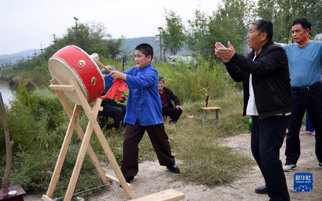 西北綜勘黃河老腔藝術(shù)團主唱薛銀照(右二)在指導秦東鎮濱河小學(xué)學(xué)生練習擊鼓(9月27日攝)。