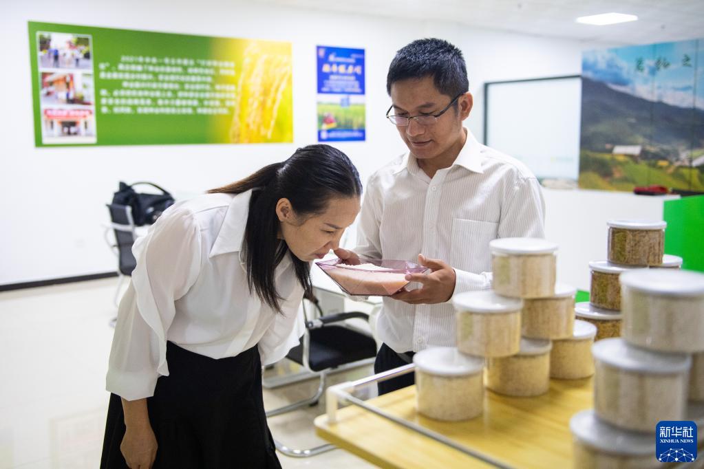 9月29日,在位于常德科技創(chuàng )新創(chuàng )業(yè)孵化產(chǎn)業(yè)園的常德糧豐農業(yè)科技有限公司,工作人員(右)向來(lái)訪(fǎng)者介紹公司培育的水稻品種。