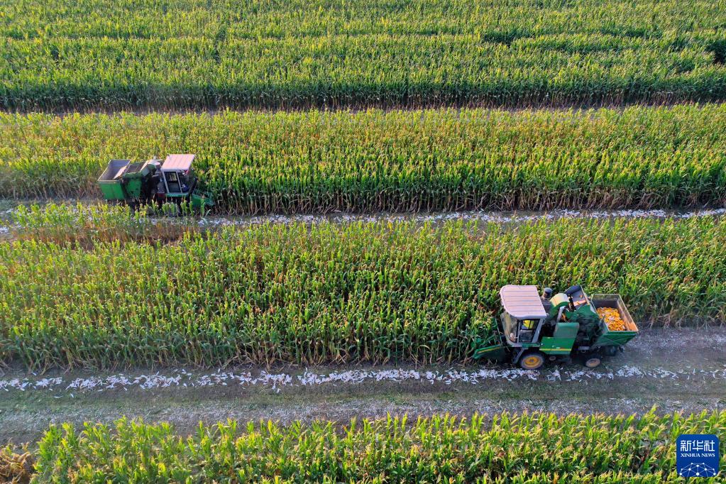 當日,山東德州樂(lè )陵市“噸半糧”核心區玉米開(kāi)始收割,農戶(hù)運用大馬力收割機、翻耕機等現代化農機裝備進(jìn)行勞作,田間地頭一派繁忙秋收景象。